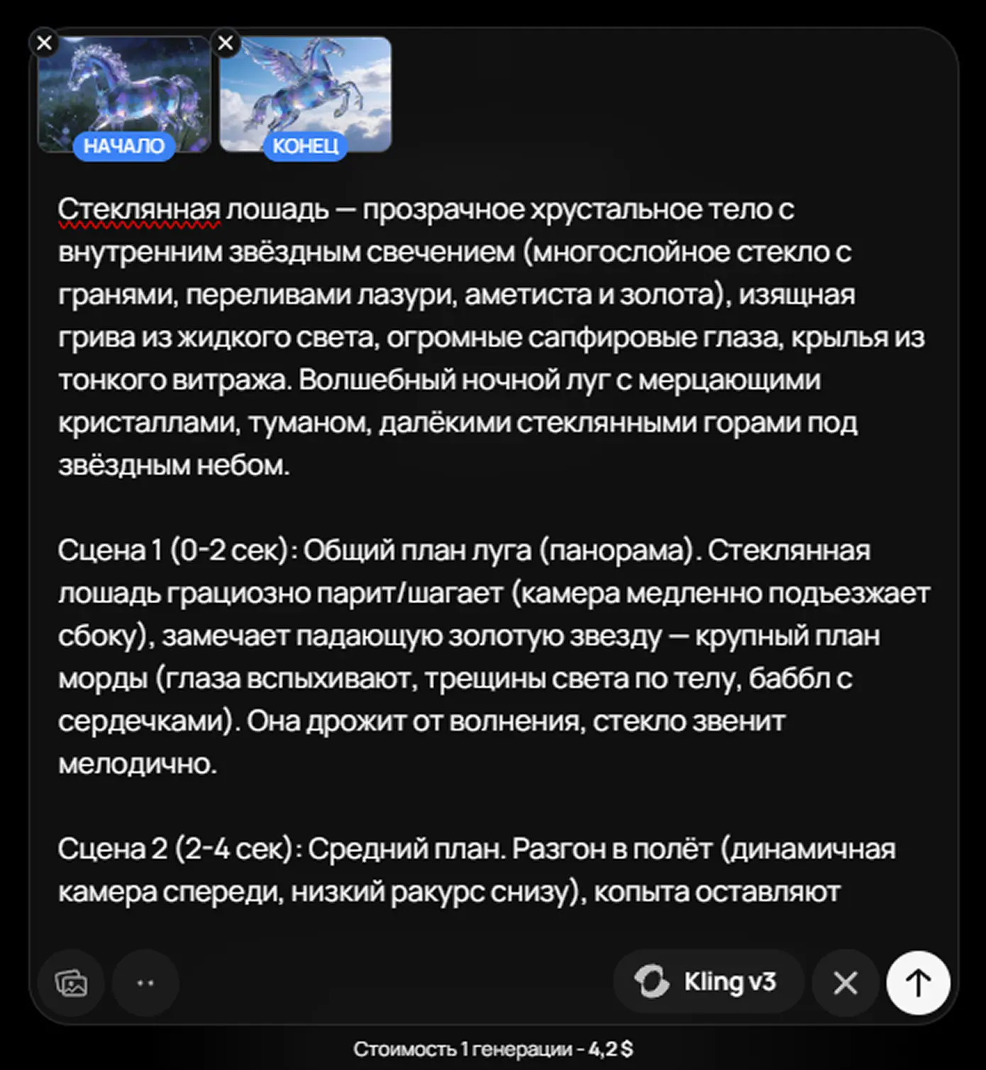 Describe your desired scene, actions, style, physics, and sound in detail. The video generation neural network understands complex, multi-part descriptions in Russian, including synchronized sound and realistic movement.