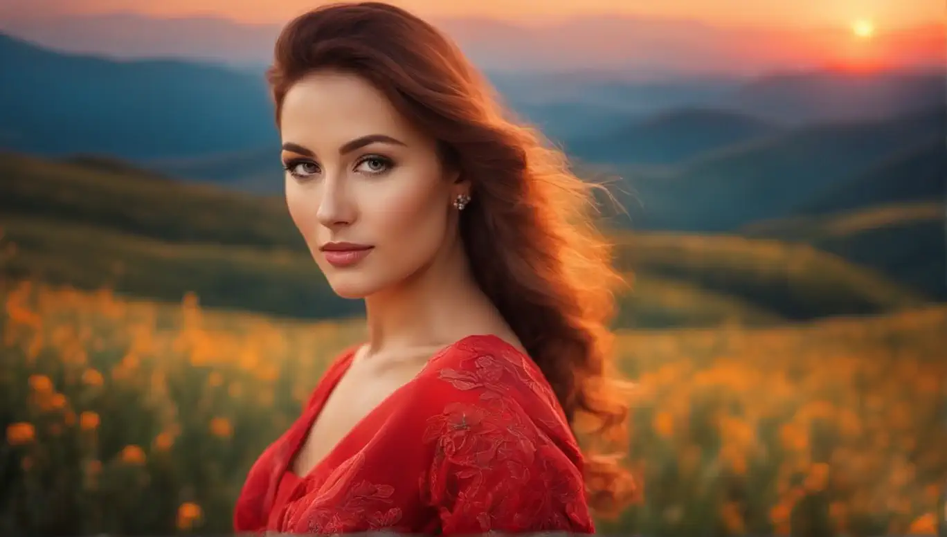 реализация произведений в стилистике oil, digital, 3D. Промт: «Портрет в стиле масляной живописи, женщина в красном платье, фон — закат в горах, крупный план»