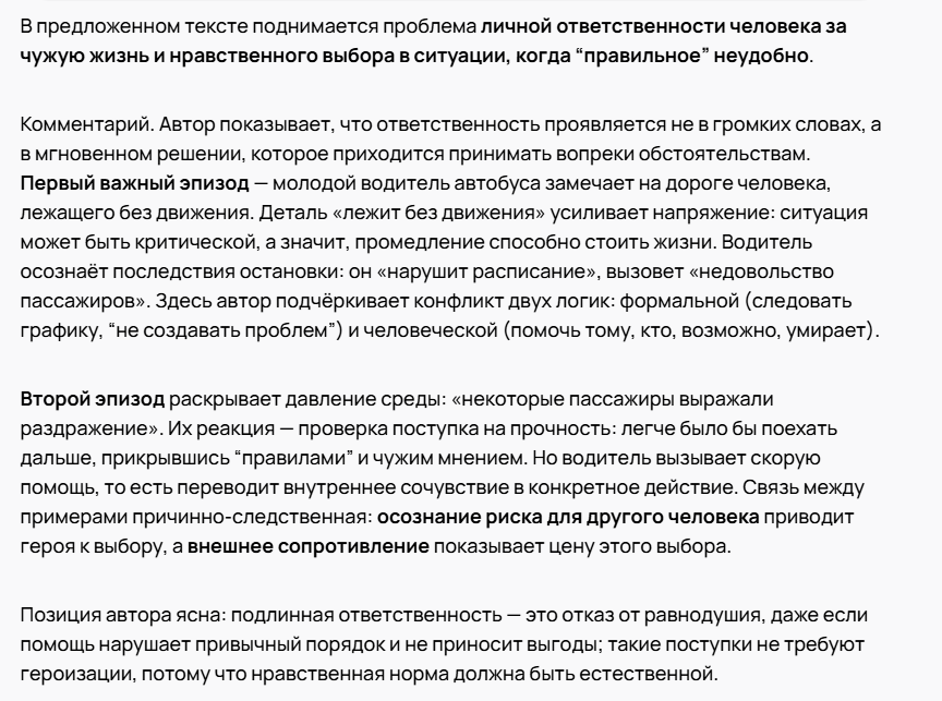 Как мы и запросили, модель углубилась в аналитику. Проблема сформулирована емко: «личной ответственности человека за чужую жизнь и нравственного выбора в ситуации, когда "правильное" неудобно». Сильная формулировка, которая полностью проходит по первому критерию. Комментарий выстроен не хуже. Два примера четко разделены синтаксически, но переплетены причинно-следственными связями: