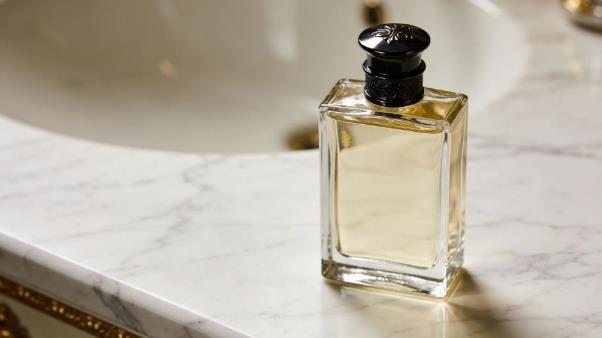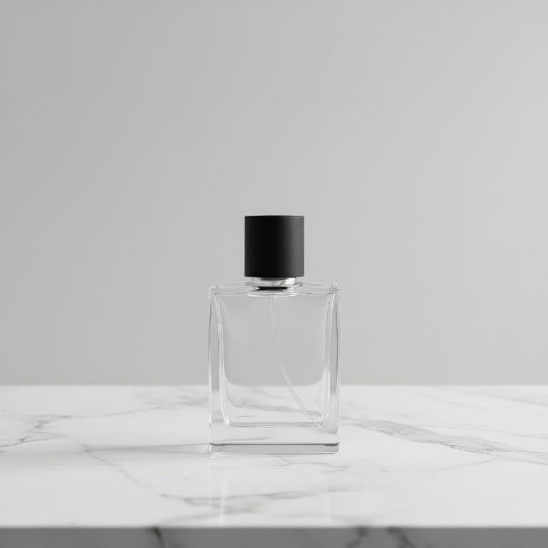 Результат – чистая студийная подача. Прямоугольный флакон с матовой крышкой и металлическим воротником выглядит объемно: края стекла ровные, блики соответствуют поведению материала, рефлексы на металле корректны. Мраморная поверхность с серыми прожилками аккуратна и правдоподобна. Боковой рассеянный свет создает мягкую тень на поверхности стола, фон нейтральный. Артефактов почти нет – есть легкий узор в стекле, похожий на «след» генерации, но он не бросается в глаза. Разрешение высокое, края четкие.