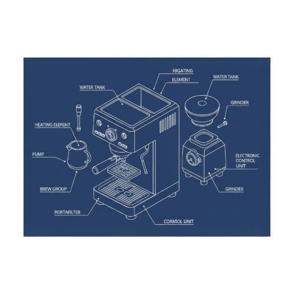 Blueprint-стиль передан верно: темно-синий фон, белые контурные линии, изометрическая перспектива. Геометрия кофемашины читается логично, пропорции выдержаны, линии ровные, без «дрожания» и разрывов. Детализация умеренная – конструкция понятна, не перегружена.