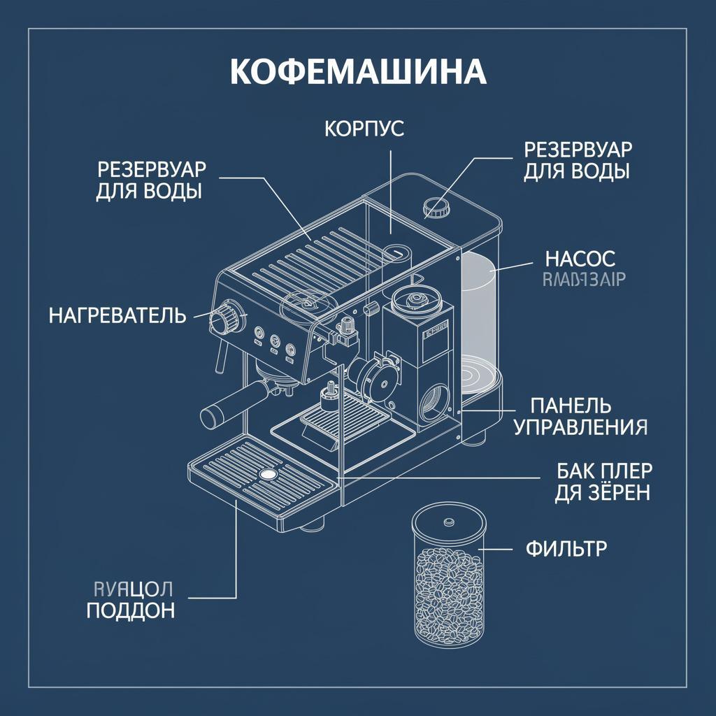 Стиль выдержан: синий фон, белые линии, изометрия. Геометрия стабильная. Плюс – корректные русские заголовки: «КОФЕМАШИНА», «КОРПУС», «РЕЗЕРВУАР ДЛЯ ВОДЫ». Шрифт читаемый, выносные линии аккуратные.
