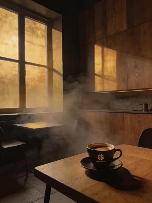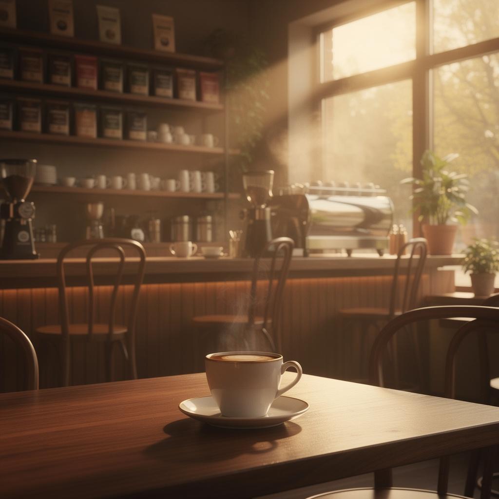 Теплый свет из окна формирует мягкие лучи и пыльно-туманную среду. Чашка в фокусе, барная стойка с оборудованием красиво размыта – глубина резкости работает именно так, как в кино.