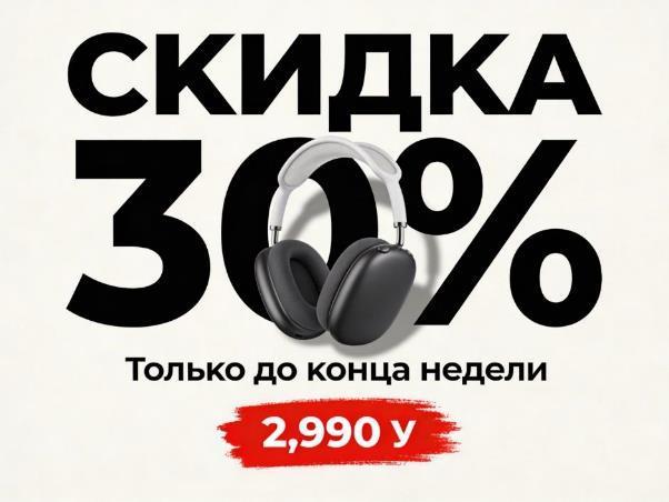 Но главная проблема композиции – наушники почти теряются на фоне крупного текста, продукт не является визуальным центром. Для рекламного баннера это принципиально: оффер читается, но товар не «продается» визуально.