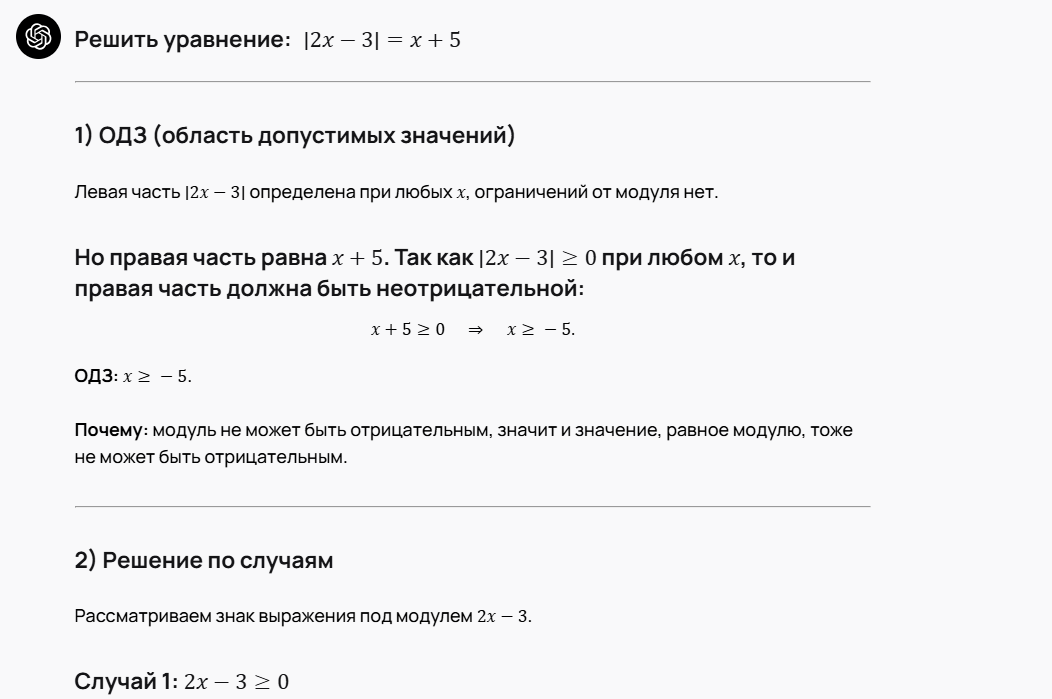 Сначала нейросеть нашла область допустимых значений: из условия (|2x − 3|\ge 0) вывела (x + 5\ge 0), то есть (x\ge -5). Затем раскрыла модуль по случаям: