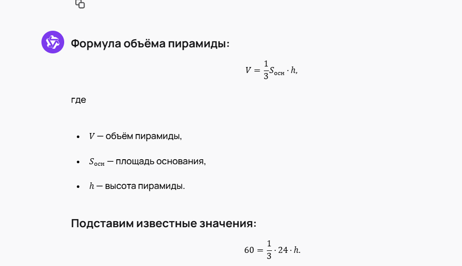 Здесь вычисления короткие, но модель четко выдерживает формат: сначала напоминает формулу (V = \tfrac{1}{3}S_\text{осн}h), затем подставляет (V = 60) и (S_\text{осн} = 24). Уравнение (60 = 8h) сводится к простому делению, и получается (h = 7{,}5). В ответе указаны единицы длины. Подход пошаговый, ясный, легко проследить, откуда берется число 7,5 и почему. А здесь – результат.