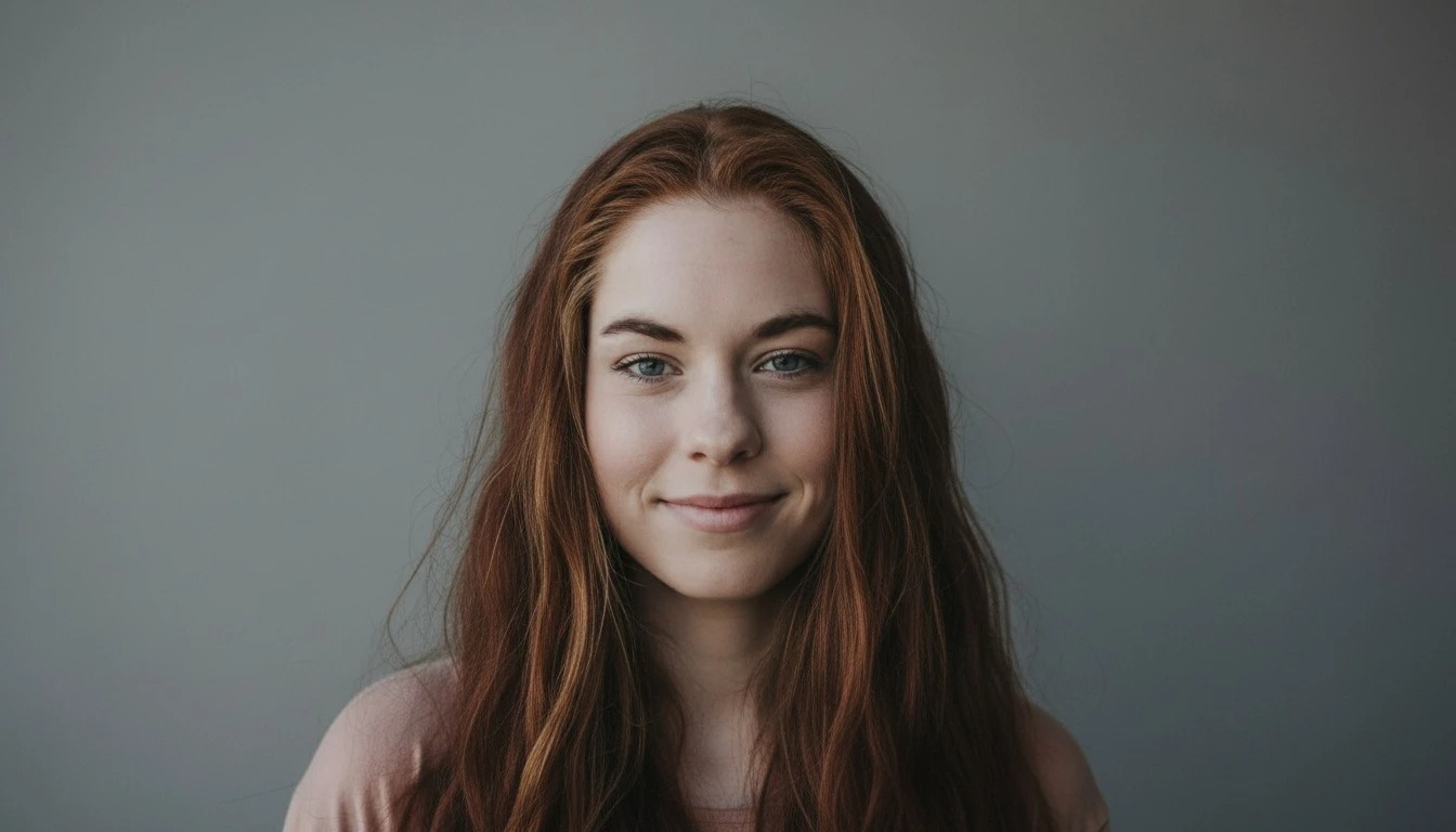 «Отредактируй портрет молодой женщины: добавь лёгкую естественную закрытую улыбку (микроподъём уголков губ и щёк, без демонстрации зубов), переложи свет на мягкий студийный с равномерными тенями, замени фон на нейтральный средне-серый без текстуры, не сглаживай и не меняй анатомию лица, форму глаз и причёску».