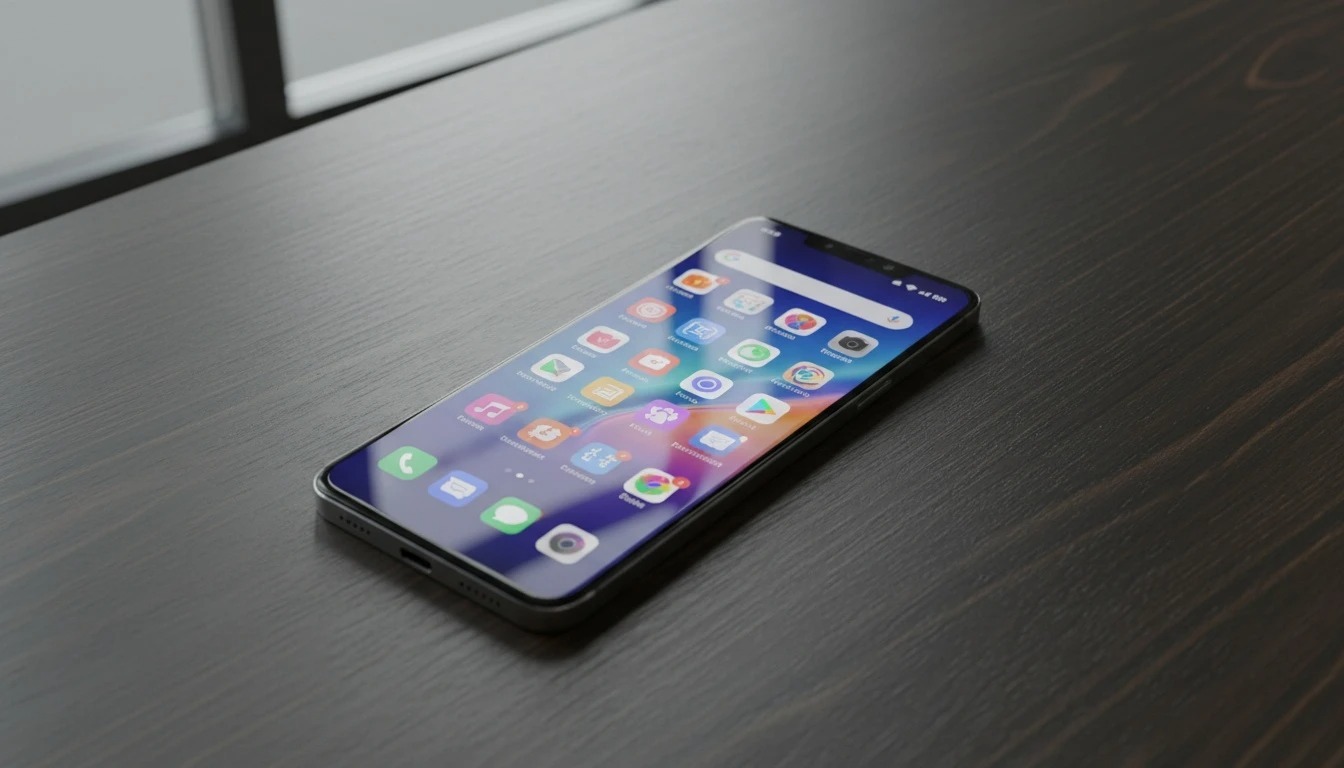 «Фотореалистичный снимок нового смартфона, лежащего на столе из темного дерева. Тонкий безрамочный корпус из матового алюминия в графитовом цвете, блок из двух селфи-камер. Экран светится, показывая главный экран с приложениями. Свет падает из окна слева, создавая длинные мягкие тени. Камера находится под углом 45 градусов, фокус на экране смартфона. Высокое разрешение, 4К».