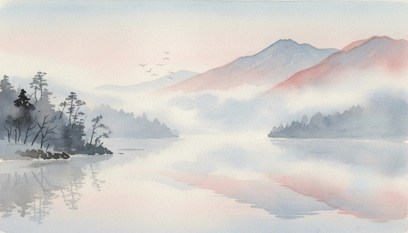 «Горное озеро на рассвете в стиле японской акварели. Густой туман стелется над водой. Цветовая палитра — пастельные, приглушенные оттенки розового и голубого. Композиция построена по правилу третей, с горами на заднем плане справа».
