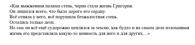 Делая анализ произведения, нейросеть точно использовала метафору «выжженной степи» как образ опустошенной жизни. Кроме того, ИИ создал удачный акцент на противоречии: земля, которая разрушает и в то же время удерживает. При этом сохранился фокус на психологическом состоянии Григория без крена в рассуждения о судьбах народа.