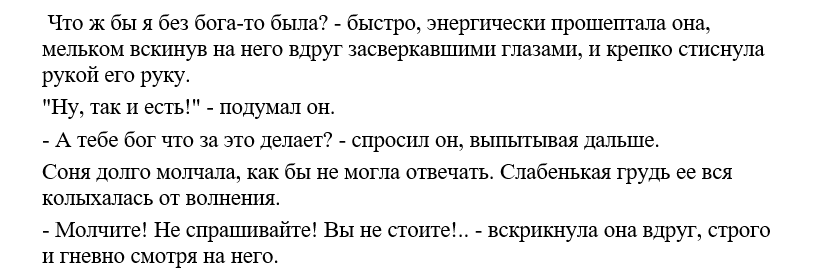 ИИ подчеркнул контраст внешней физической слабости Сони («слабенькая грудь») и внутренней силы («быстрая, энергическая речь, засверкавшие глаза»). Также нейросеть отметила, что реплика «Вы не стоите» – это не эмоциональный срыв, а нравственный приговор. Кроме того, ИИ сфокусировался на вере, которая для Сони – фактическая опора, помогающая жить.