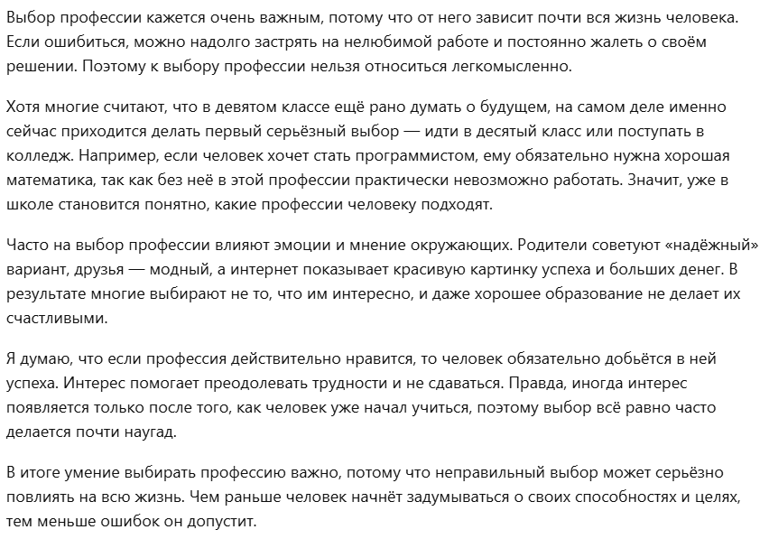 Искусственный интеллект для учителей подробно разобрал структуру работы, указал логические противоречия («если выбор наугад, то зачем торопиться?»), отметил обобщения. Кроме того, ИИ посоветовал усилить аргументацию, например за счет статистических данных, дописать практические шаги (стажировки), улучшить структуру (добавить переходы между абзацами).