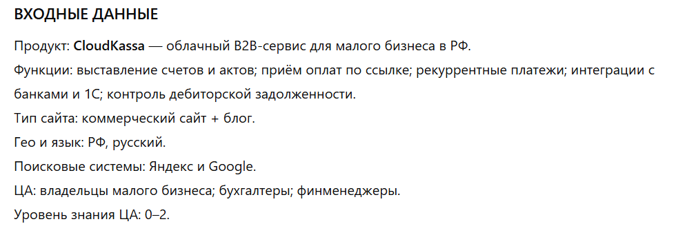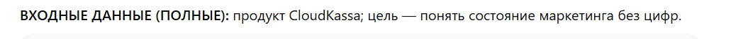 Цель: получить понятную и воспроизводимую структуру маркетингового отчета для CloudKassa, которая позволяет оценить состояние маркетинга качественно, без цифр: где система работает, где ломается, и какие решения можно принимать дальше.