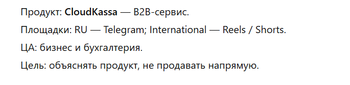 Цель: получить список тем для SMM (посты + короткие видео) с образовательным фокусом, проверить, умеет ли модель объяснять продукт без прямой продажи и адаптироваться под Telegram и Reels/Shorts.