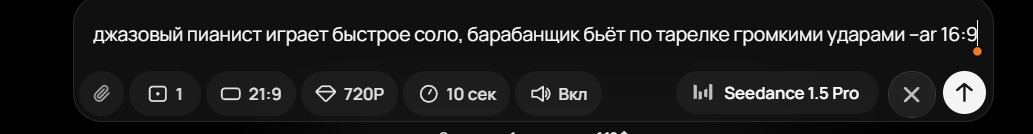 В GPTunneL Seedance 1.5 Pro генерирует видео в двух форматах: 5 или 10 секунд. Вы можете сами выбрать длину видео, соотношение сторон, качество (720p или 480p), а также решить, добавлять ли аудио или нет.